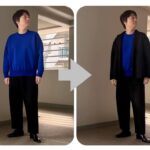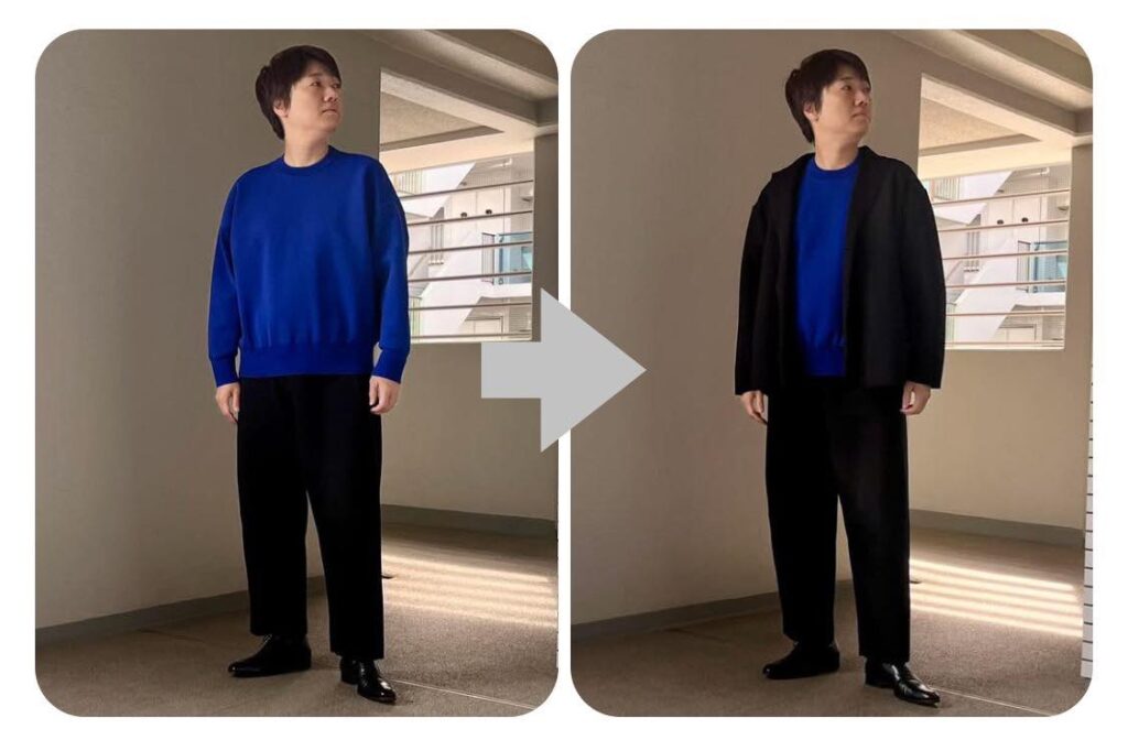 左右写真は、ブルーのトップス丈は同一ですが、黒いカジュアルアウターを羽織ることで長すぎる印象を回避しているのです