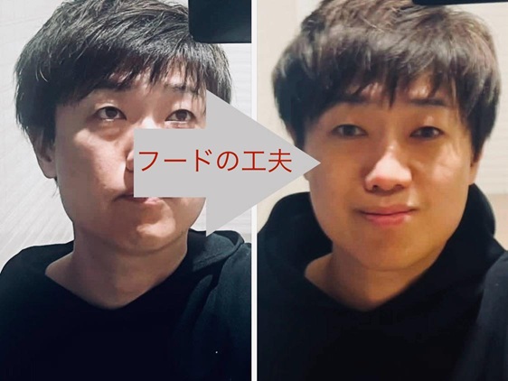 でも写真右のようにフードの輪郭を立ててあげることで、だらしない印象を解消していたのです