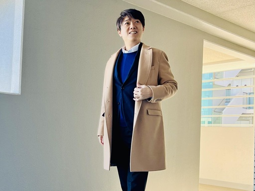 ジャケットとセーターの色を近づけておかないと、写真のような明るいコートを着用した時、セーターとジャケットの色が散らかってしまうのです